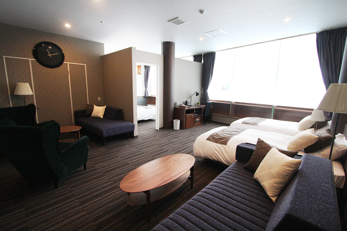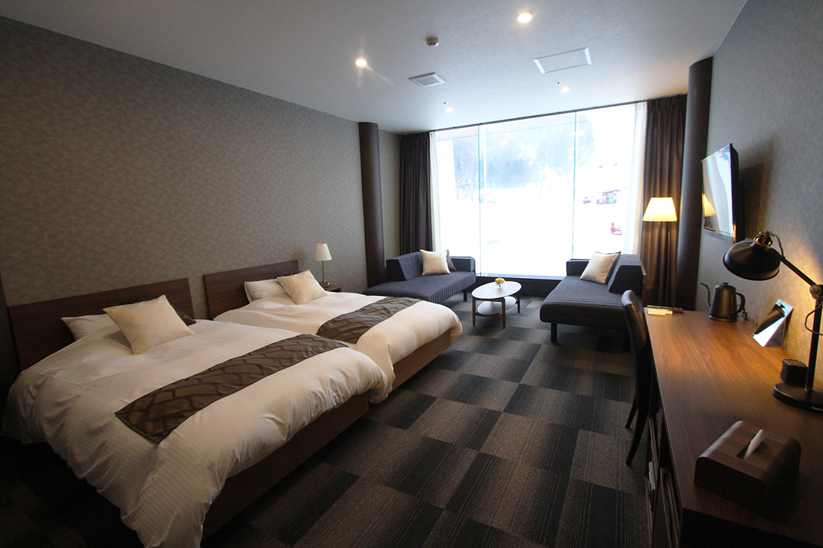 スタンダードルームでも約30㎡のお部屋面積があり、ゆったりと滞在が可能です。お部屋の大きな窓からはスキー場を一望できることも大きな魅力です。ささやかながらウェルカムドリンクも用意させて頂いております。Even the standard room has a spacious area of about 30 square meters. The large windows offer amazing views of the ski slopes and (the often) falling snow. We also provide a small welcome drink.
